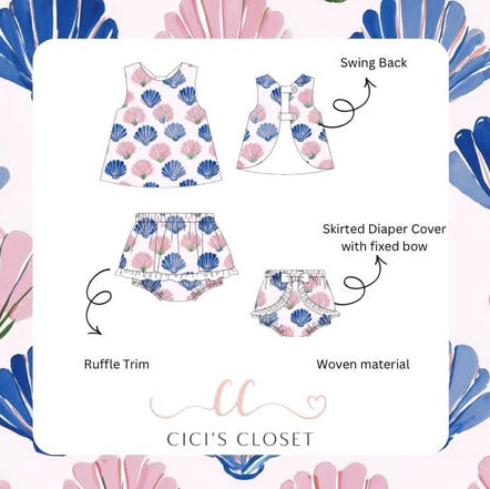The top features fixed shoulder bows and a gently gathered smocked bodice that creates a comfortable, flowy silhouette. Sweet scalloped edges add an extra touch of heirloom charm, while the matching bloomers complete the look.